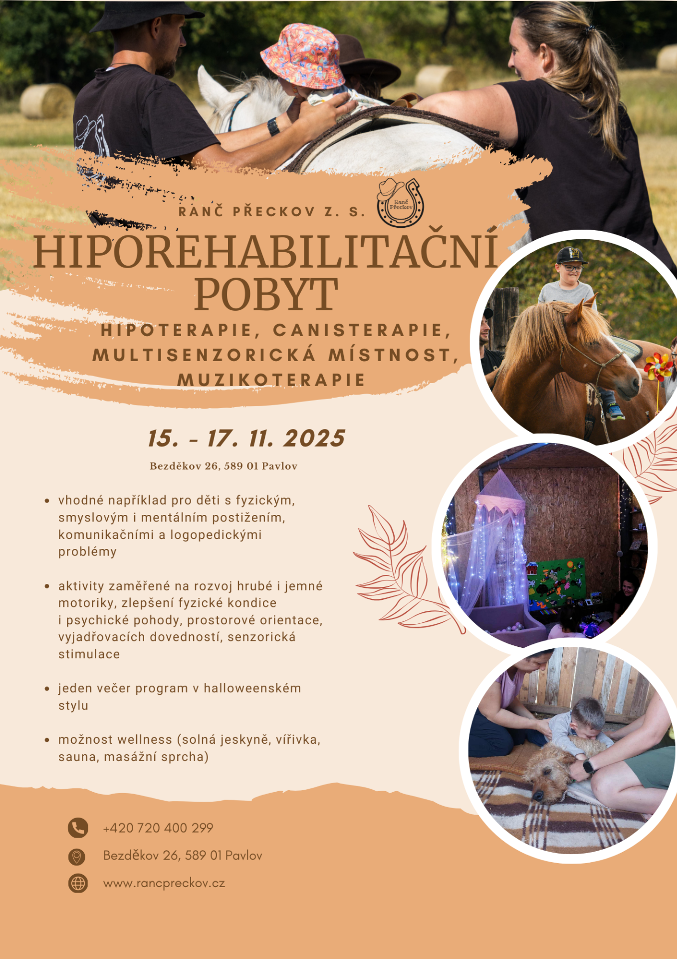 Nabízíme podzimní hiporehabilitační pobyt, který pořádáme na spřáteleném Ranči nedaleko Třeště. Ranč nabízí veškerý komfort zázemí - v místě je bezbariérové ubytování v krásném Africkém stylu, restaurace, wellness - vířivka, masážní sprcha, solná jeskyně, sauna. Na ježdění je k dispozici krytá, uzavřená hala a hipoterapie se tak mohou realizovat za jakéhokoliv počasí.