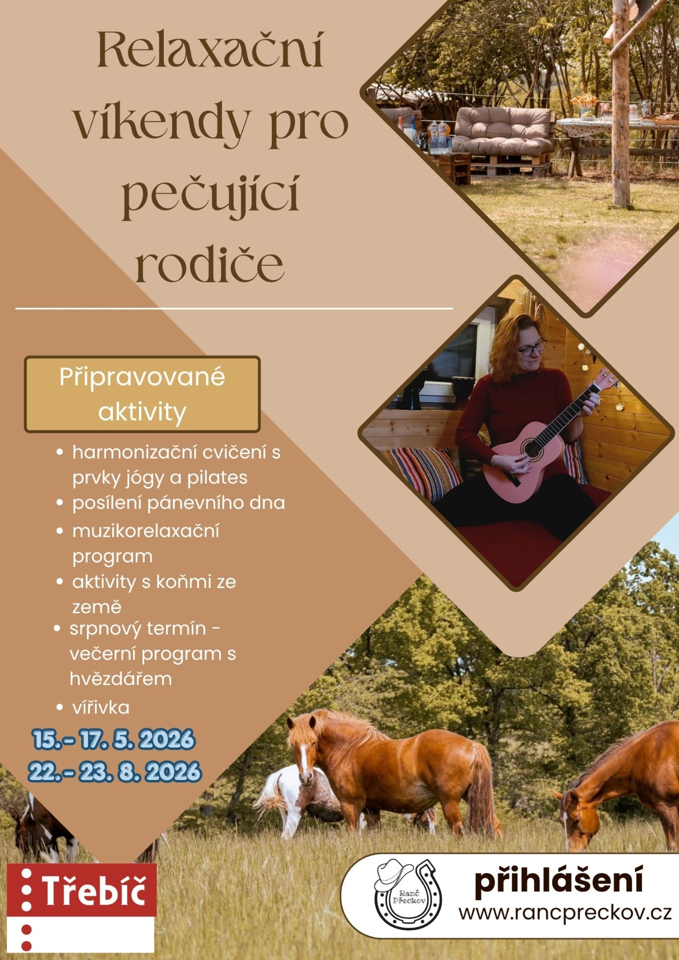 Připravili jsme pro vás jedinečné víkendové pobyty, které jsou vytvořené přesně pro pečující rodiče – pro ty, kteří jsou zvyklí být neustále v pohotovosti, řešit, organizovat, pomáhat… a často nemají čas sami na sebe. Programu se může účastnit každý i bez předchozích zkušeností.